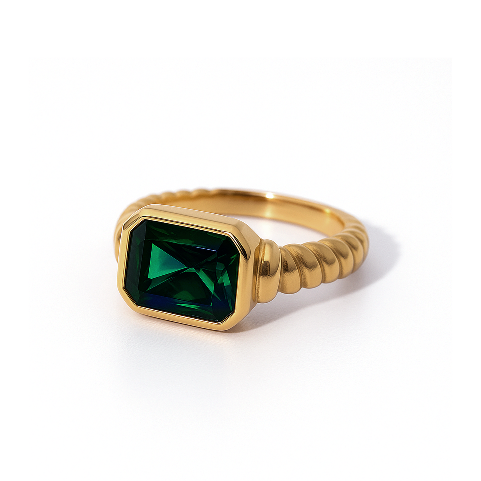 This emerald cut ring brings refined elegance to your collection with its deep, luminous stone that complements any aesthetic. Designed for the discerning wearer, it balances classic sophistication with everyday practicality—waterproof and tarnish-resistant construction ensures it maintains its pristine appearance through daily wear.