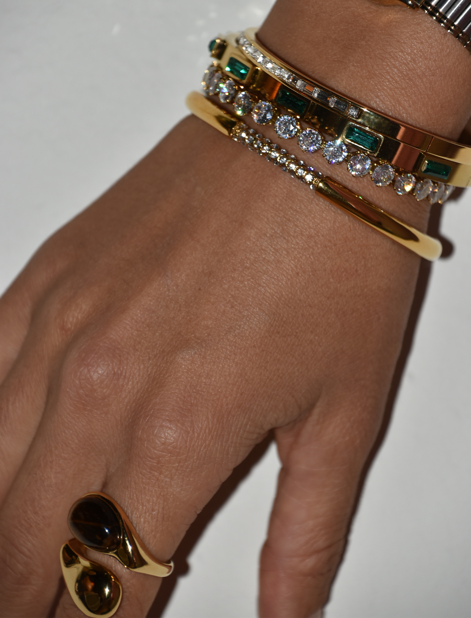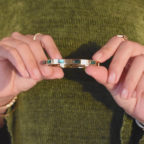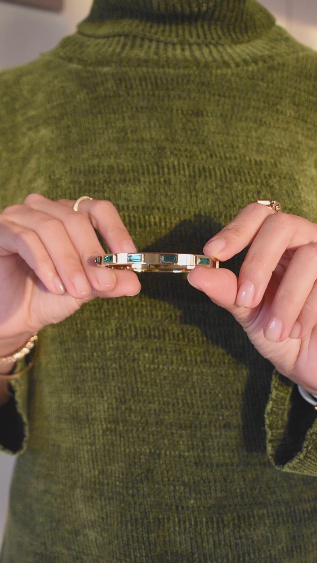 This emerald hinged bangle bracelet showcases sophisticated style with exceptional durability, featuring premium 18k gold-plated stainless steel that resists tarnishing and water damage. The vibrant emerald tone delivers an elegant pop of color while maintaining a refined aesthetic perfect for timeless design.