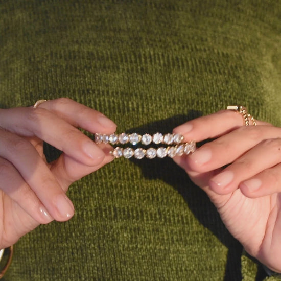 This striking tennis-style flexible bangle bracelet merges timeless elegance with thoughtful engineering, featuring premium 18k gold plating over stainless steel that resists tarnish and water exposure. Its structured design provides secure comfort without slipping or catching hair, delivering both beauty and wearability.